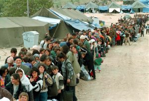 SKO12-19990506-BLACE, MACEDONIA (FYROM): Some 3.000 Albanian refugees wait in line in the temporary refugee camp in Blace, to be transported to the camp of Cegrane, on Thursday 06 May 1999. The border was closed for refugees 06 May by Macedinia authorities with the explanation that all the refugee camps in Macedonia were overcrowded. According to the UN High Commission for Refugees some 4.000 people are waiting to cross the border from from Kosovo. Photo: EPA/MLADEN ANTONOV