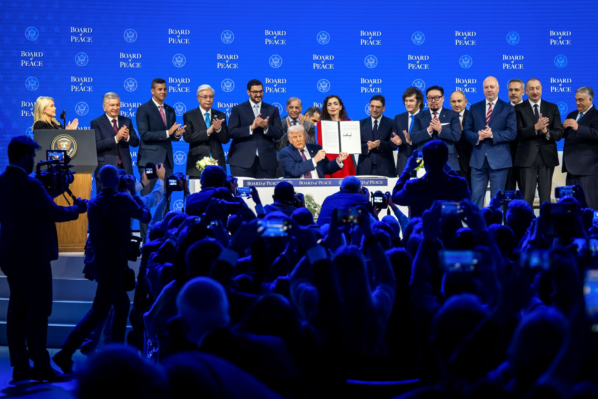 US President Donald Trump (C) holds a signed founding charter at the ‘Board of Peace’ meeting during the 56th annual meeting of the World Economic Forum (WEF), in Davos, Switzerland on January 22, 2026. Photo: EPA/GIAN EHRENZELLER