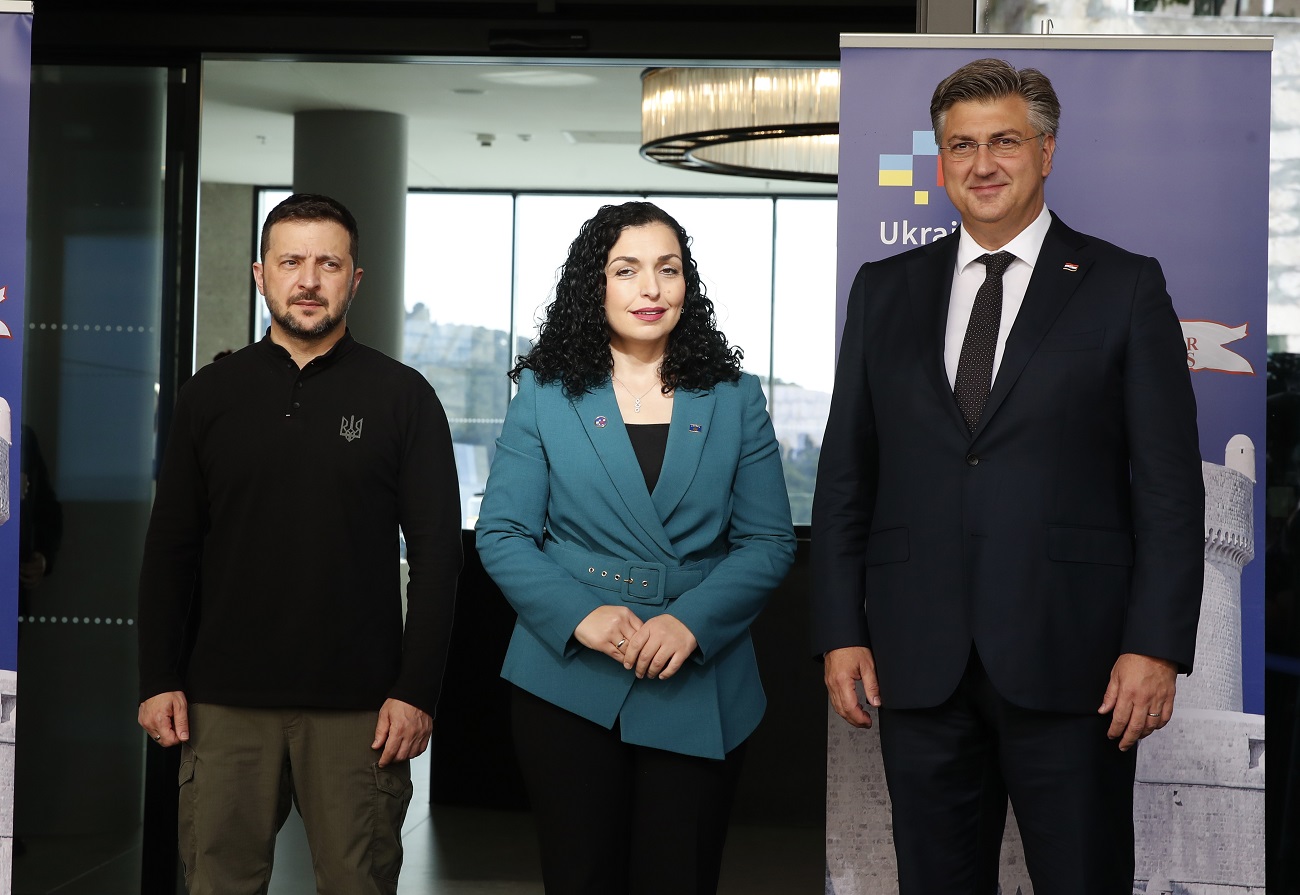 Croatian Prime Minister Andrej Plenkovic (R) and Ukrainian President Volodymyr Zelensky (L) welcome President of Kosovo Vjosa Osmani (C), during the Ukraine – Southeast Europe high level meeting in Dubrovnik, Croatia, October 9, 2024. Photo: EPA/ANTONIO BAT