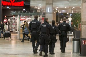 In this Dec. 22, 2016 photo police units walk through the shopping centre "Centro" in Oberhausen, Germany. Two men were arrested in Duisburg on the suspicion of planning an attack on the shopping centre. (Arnulf Stoffl/dpa via AP)