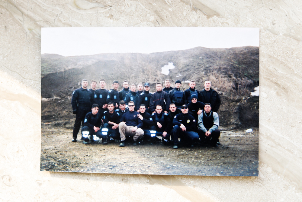A photo from 2002 shows Hikmete Imeraj, bottom left, with her Close Protection Unit (CPU) colleagues and an American instructor. Until 2008, Imeraj was the only woman in the Kosovo Police’s CPU.